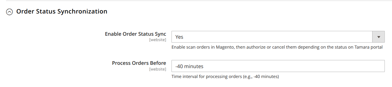 - Enable Order Status Sync: Enable cron job to scan orders in Magento, then authorize or cancel them depending on the status on Tamara portal