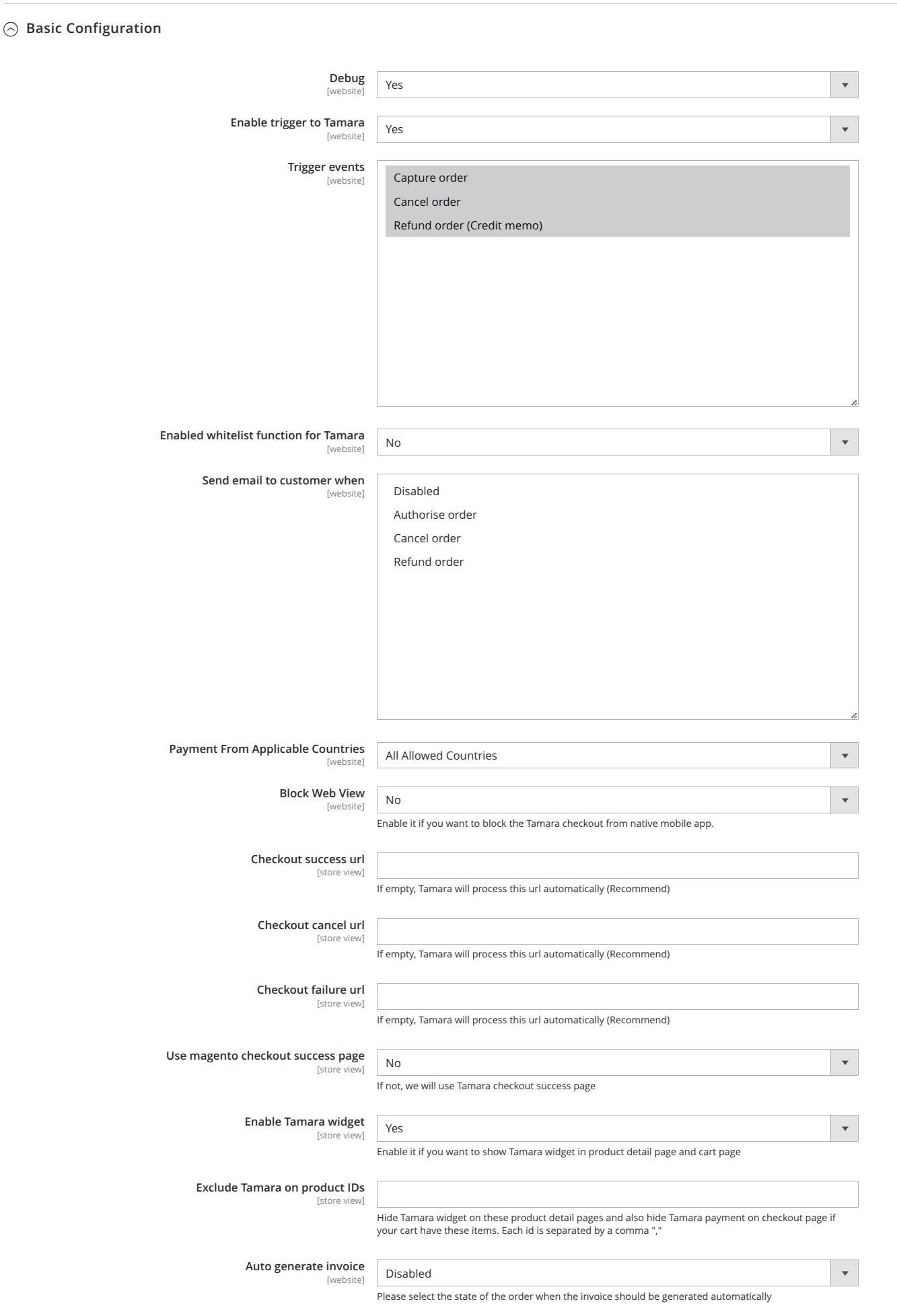 - Yes: If enabled, this option allows you to automatically trigger Capture, Cancel and Refund order to Tamara when you perform corresponding action in Magento or not. If disabled, you need to integrate with our APIs directly or use our Partners Portal to do so.
