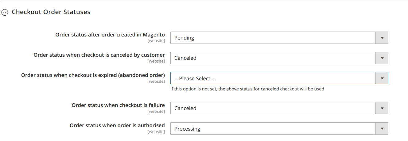 - Order status when checkout is canceled by customer: The status that you want to set for the order if the payment is canceled by the customer.