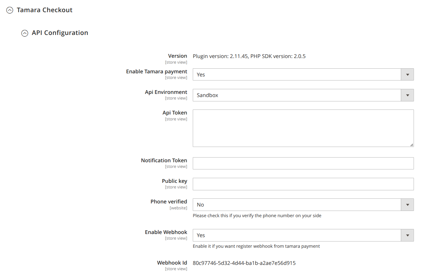 On your Admin Panel, click on Stores > Configuration > Sales > Payment Methods > Tamara Checkout