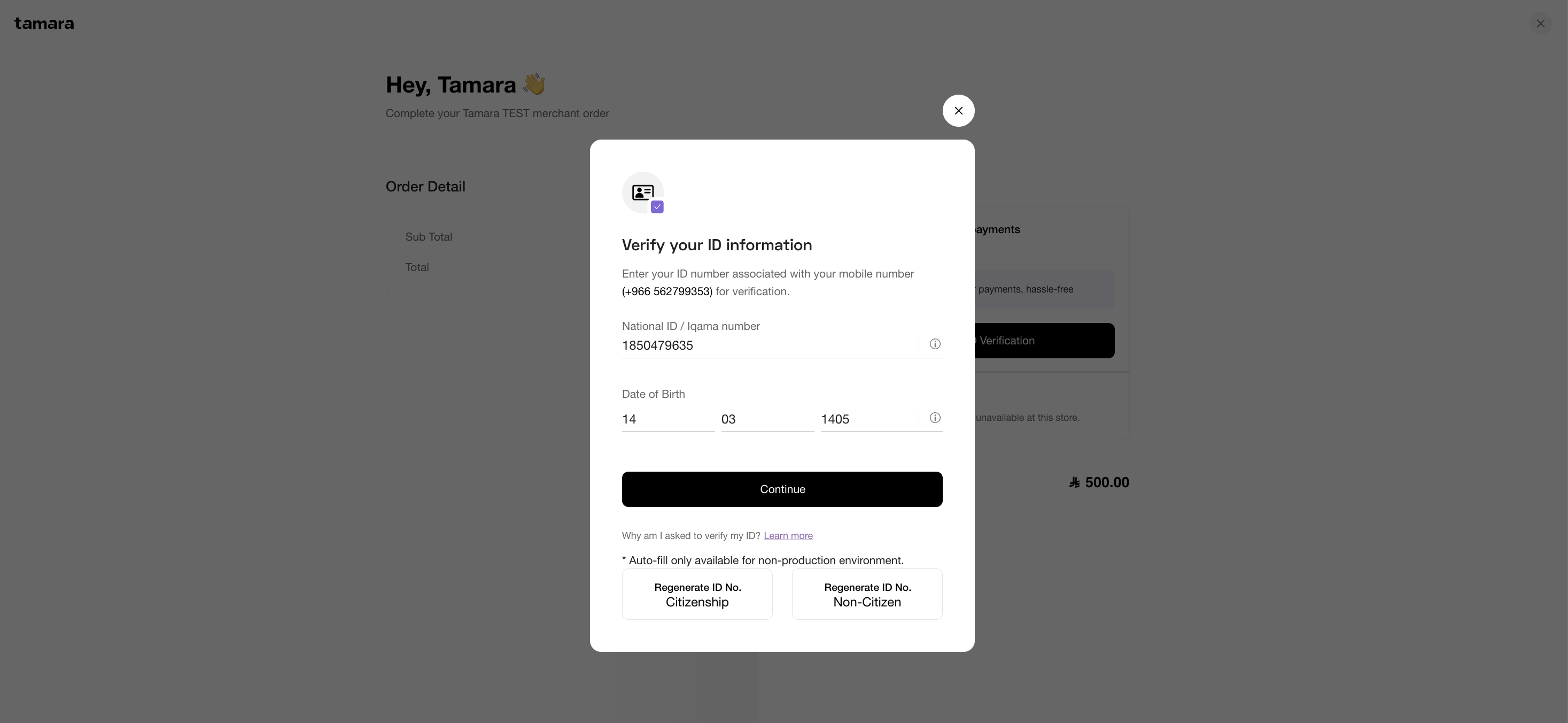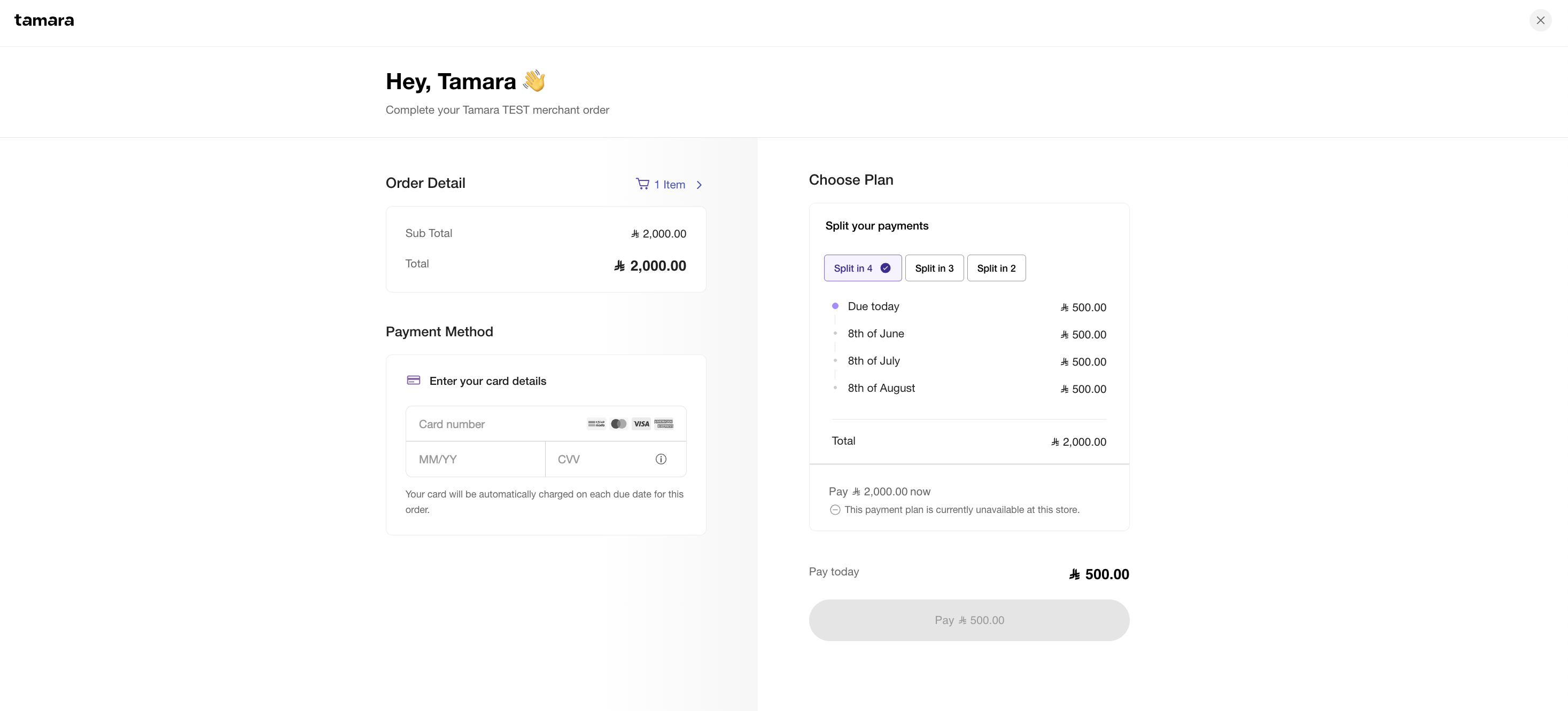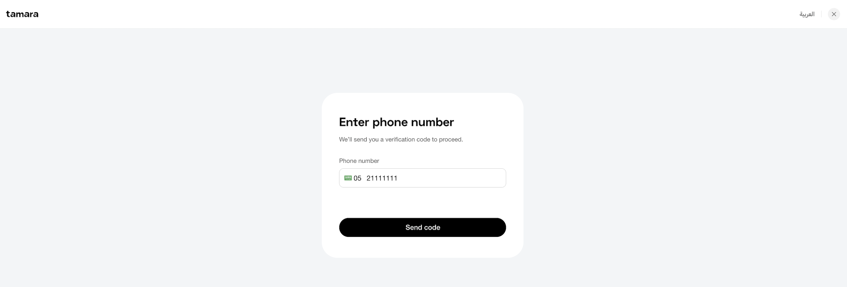 Please use any of your actual bank cards, Tamara supports a wide range of card types such as VISA, MasterCard, MADA(🇸🇦 KSA Only) & AMEX(🇸🇦 KSA Only) for customers to choose from.