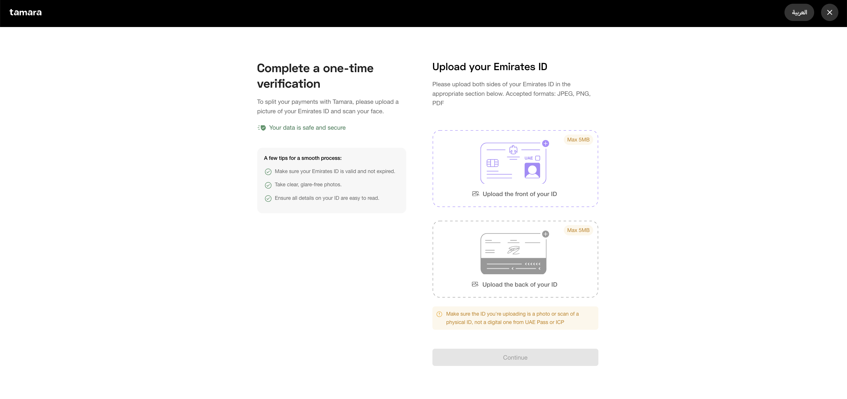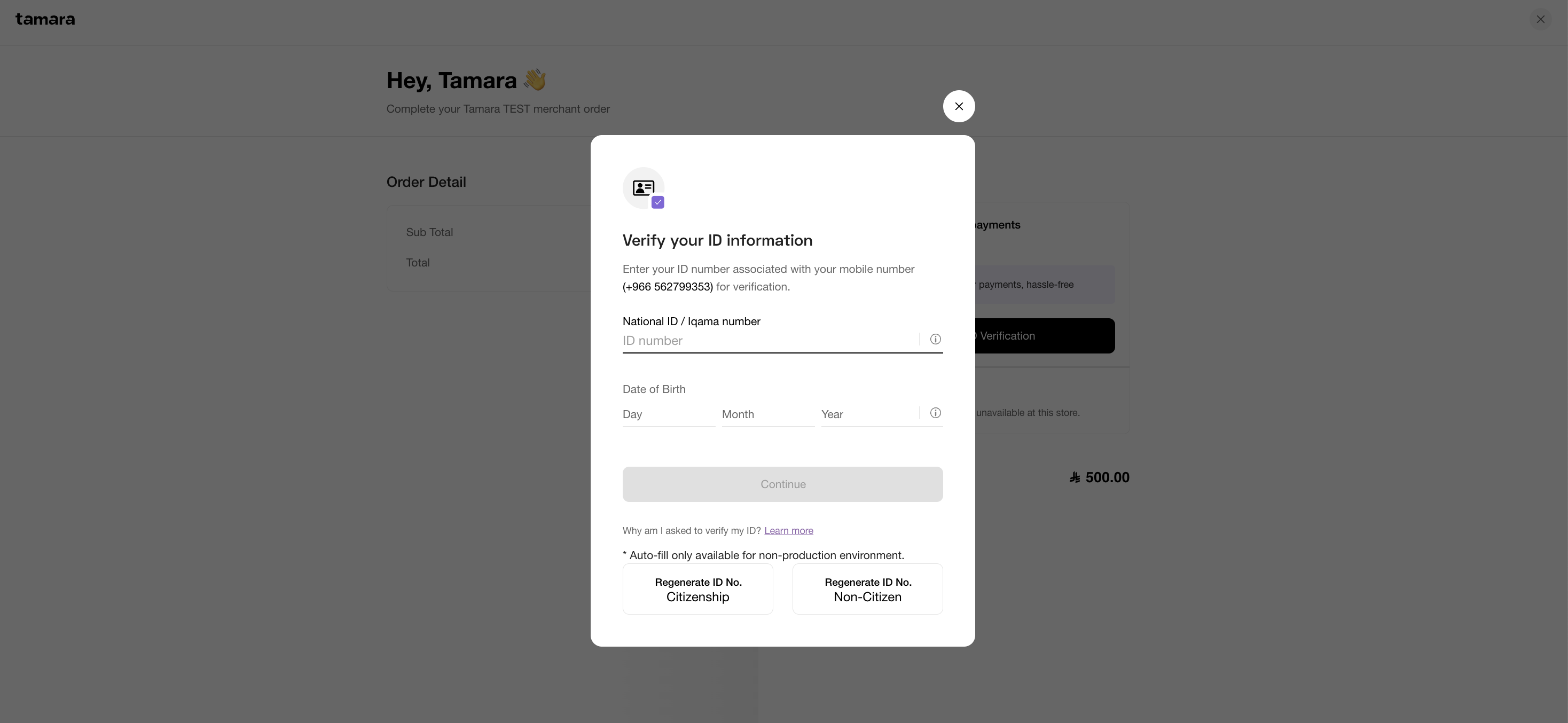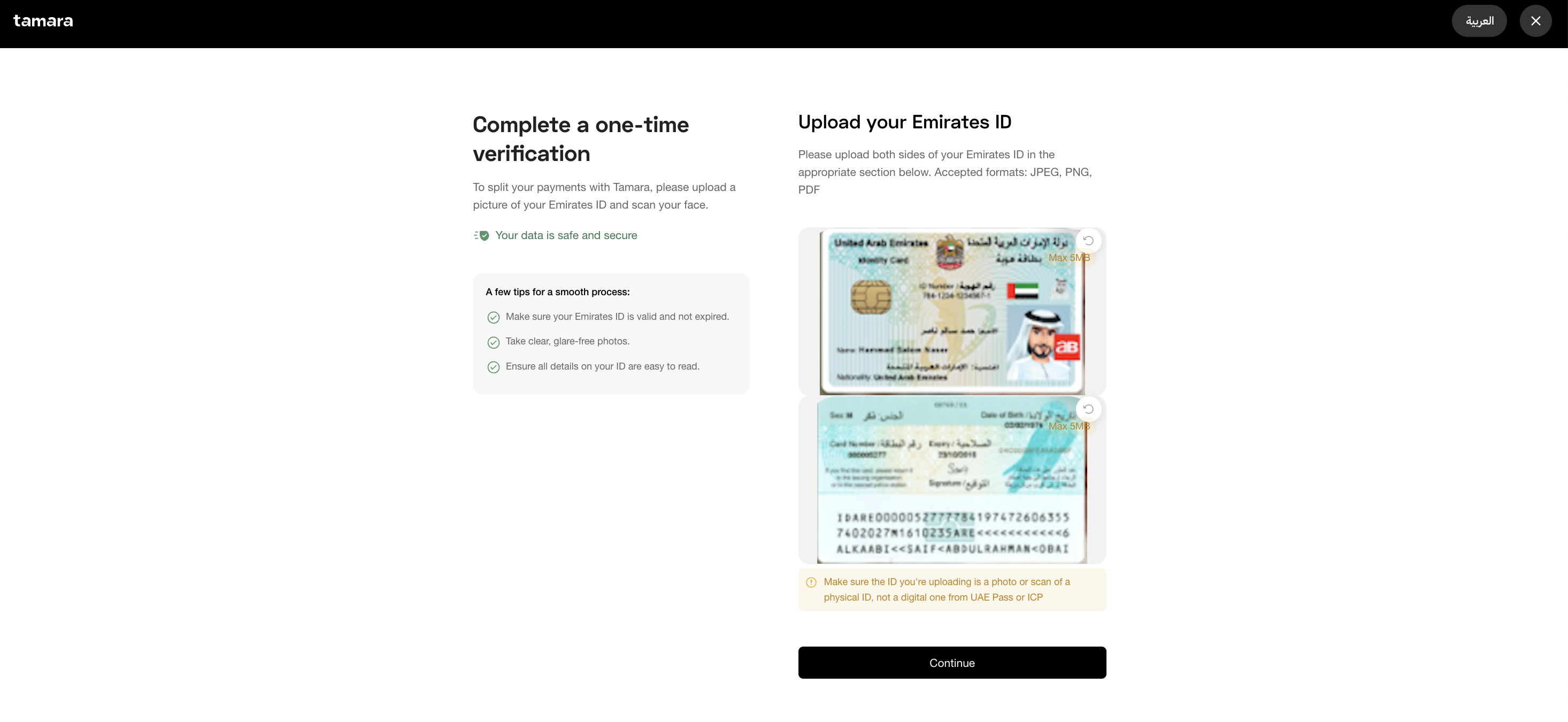 Please use any of your actual bank cards, Tamara supports a wide range of card types such as VISA, MasterCard, MADA(🇸🇦 KSA Only) & AMEX(🇸🇦 KSA Only) for customers to choose from.